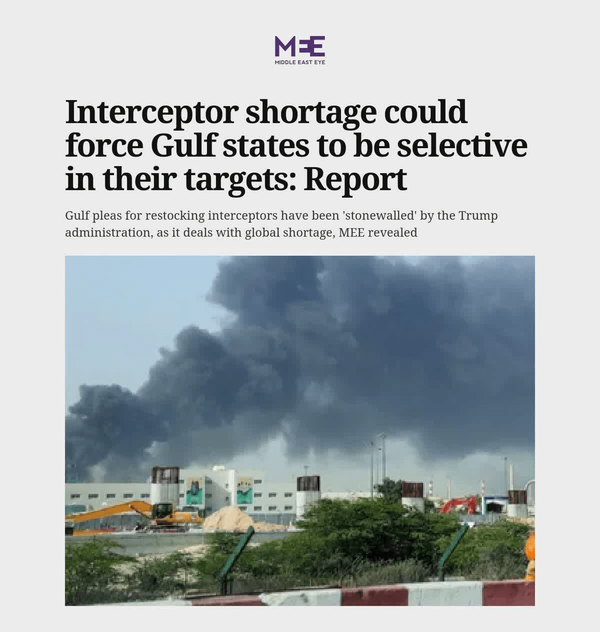 @Jobseyed6 دقیقه پیش❌میدل ایست آی: کمبود موشکهای پدافندی در کشورهای خلیج [فارس] باعث شده که آنها مجبور شوند بین اماکنی که میخواهند از آن دفاع کنند، دست به اولویتبندی بزنند.