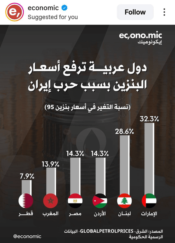 🔴درصد تغییر افزایش قیمت بنزین در کشورهای عربی ،متأثر از جنگ 🔺امارات بالاترین درصد افزایش قیمت و قطر کمترین افزایش قیمت را داشته اند