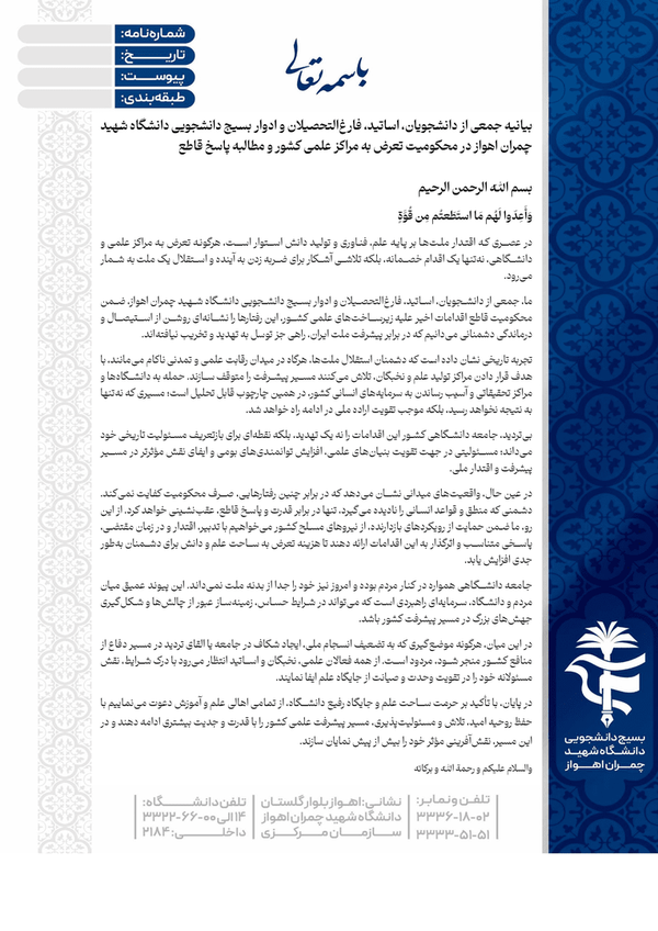 @Basij_scu16hبیانیه جمعی از دانشجویان، اساتید، فارغالتحصیلان و ادوار بسیج دانشجویی دانشگاه شهید چمران اهواز در محکومیت تعرض به مراکز علمی کشور و مطالبه پاسخ قاطع: