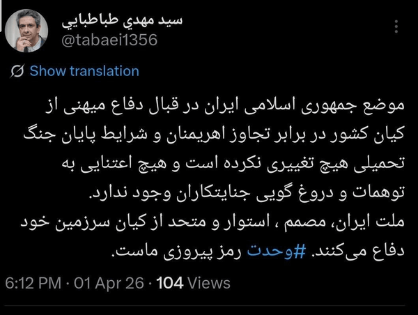 معاون اطلاعرسانی دفتر رئیسجمهور: موضع جمهوری اسلامی در برابر تجاوز اهریمنان و شرایط پایان جنگ تحمیلی هیچ تغییری نکرده