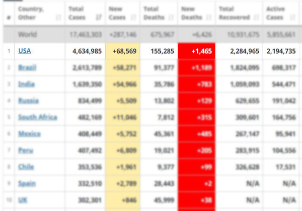 آخرین آمار اعلامی از آمریکا حاکی از آن است که شمار مبتلایان ویروس کرونا در این کشور بیش از شصتوهشت هزار نفر در بیستوچهار ساعت گذشته افزایش داشته است.