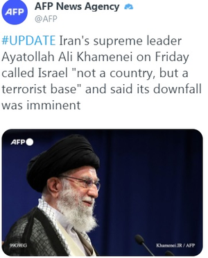خبرگزاری فرانسه هم نوشت آیتالله علی خامنهای رهبر ایران روز جمعه اسرائیل را نه یک کشور بلکه پایگاهی تروریستی توصیف کرد و افزود سقوط آن نزدیک است در انتهای این گزارش ذکر شده که «جمهوری اسلامی ایران اسرائیل را به رسمیت نمیشناسد و حمایت از آرمان فلسطین یکی از ستونهای سیاست خارجی ایران از زمان انقلاب سال ۱۹۷۹ بوده است.» روزنامه صهیونیستی «اسرائیل هیوم» از نشریههای صهیونیستی هم گزارش داد: روز جمعه در بزرگداشت روز قدس در ایران، روز اعتراض به اسرائیل و صهیونیسم، رهبر ایران اعلام کرد اسرائیل «یک کشور» نیست. در بخش دیگری از این گزارش عنوان شده که این اظهارات یک روز بعد از آن بیان شد که «حسن روحانی» رئیسجمهور ایران هم اسرائیل را به عنوان «دشمن» خاورمیانه محکوم کرد. شبکه صهیونیستی «آی ۲۴» هم با این عنوان که رهبر انقلاب در سخنرانی روز قدس اسرائیل را «اردوگاهی تروریستی» خواند، به بازتاب بیانات ایشان پرداخت. در این گزارش گفته شده که رهبر معظم انقلاب اسلامی اعلام کردند سقوط اسرائیل آغاز شده و ارتش این رژیم، ارتشی است که هرگز دیگر پیروز نخواهد شد. به نوشته پایگاه اینترنتی این شبکه، ایشان خواستار مقاومت فلسطینیها و حمایت شهدای فلسطینی از سوی ملتهای مسلمان شدند. شبکه لبنانی «المنار» هم با این تیتر «امام خامنهای: حرکت نزولی رژیم صهیونیستی آغاز شده و متوقف نخواهد شد» سخنان امروز رهبر انقلاب اسلامی به مناسب روز جهانی قدس را پوشش داد.