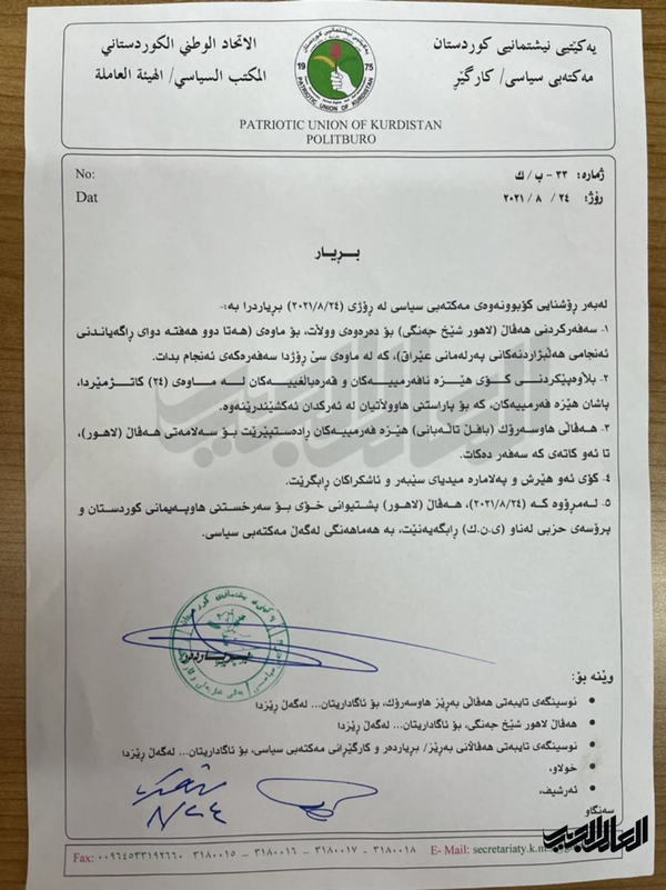 دفتر سیاسی حزب اتحادیه میهنی کردستان با صدور مجموعه دستوراتی، یکی از روسای مشترک این حزب را به ترک عراق و عدم بازگشت به کشور تا دو هفته پس از اعلام نتایج انتخابات ملزم کرد.