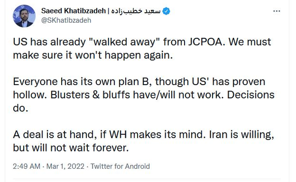خطیبزاده: ایران برای توافق، تا همیشه صبر نمیکند